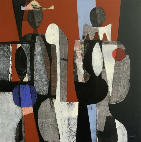 Harlequins have been a recurring theme in my work for many years. I rarely, if ever, intentionally paint one. Rather they seem to emerge spontaneously when I am painting abstractly, or so I think. At a certain point in the painting process I begin to recognize some form of a harlequin emerging. Each harlequin is…