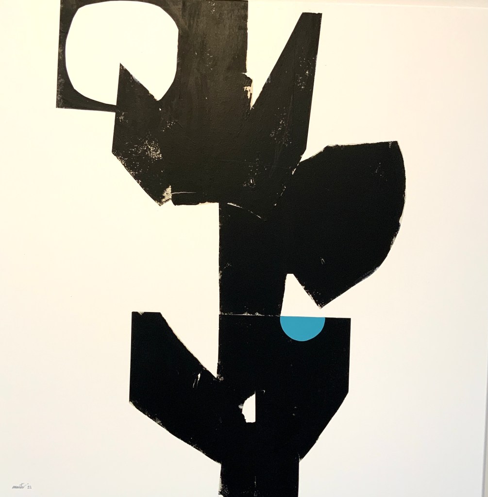 “Desert Flower” is part of a new, emerging minimalist series in 2022. The series features bold, graphic works in black with a small, singular element of color. The key word here is “restraint”, which is easier said than done. So much more could be added to any piece in this series and yet the powerful, spontaneous, suggestive essence of the original black forms would be lost in doing so.