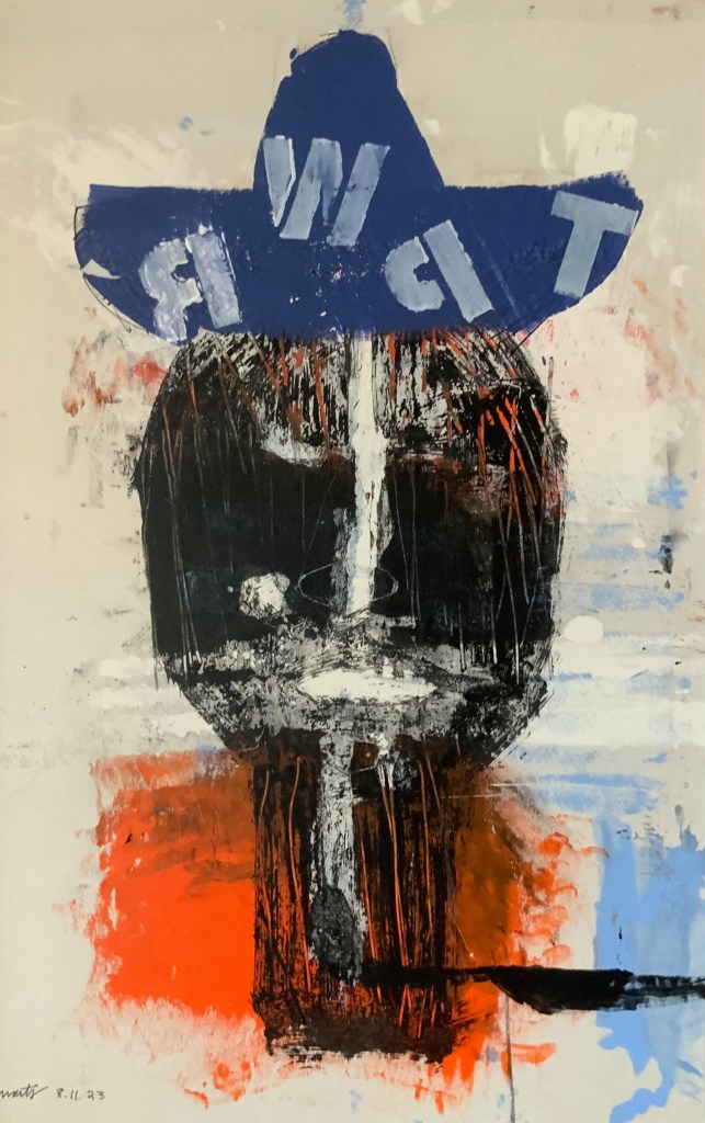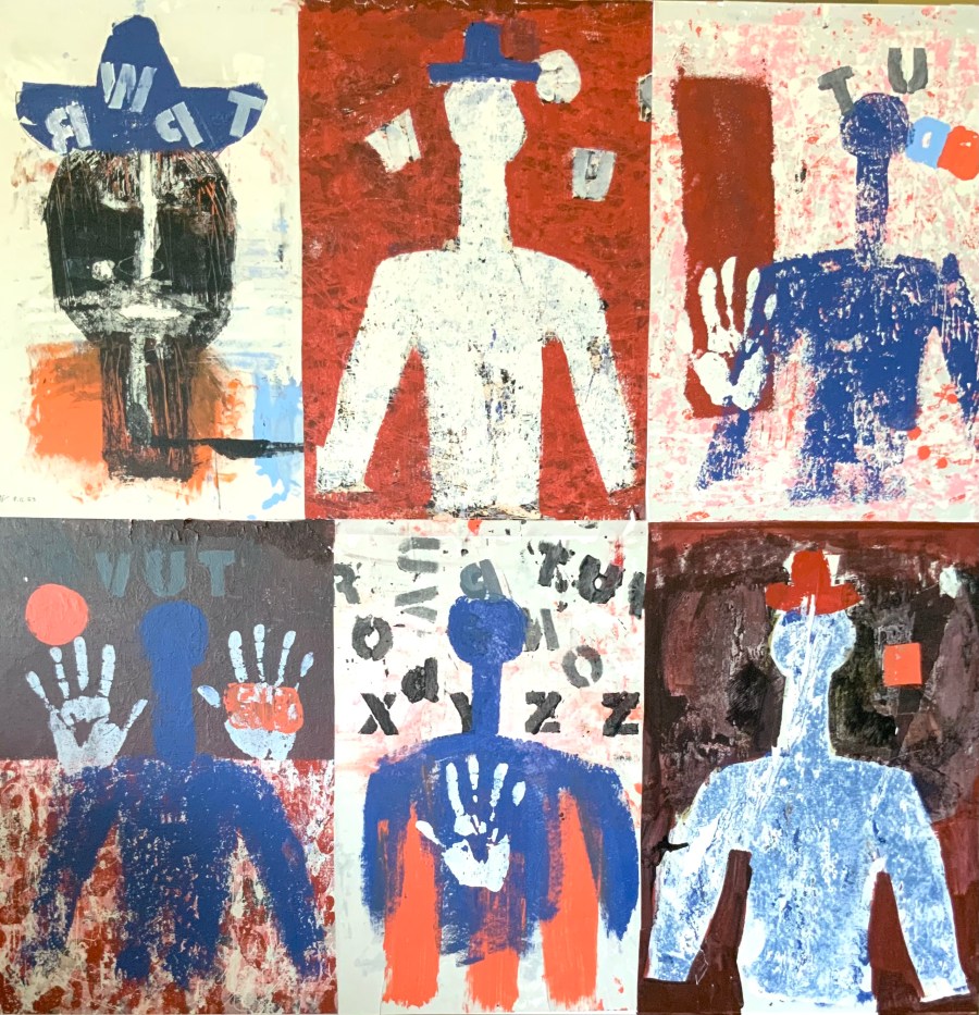 “THINKING CAPS”, 48″ X 48″, mixed acrylic media and paper on canvas, Denise C. Marts, 2023, all rights reserved