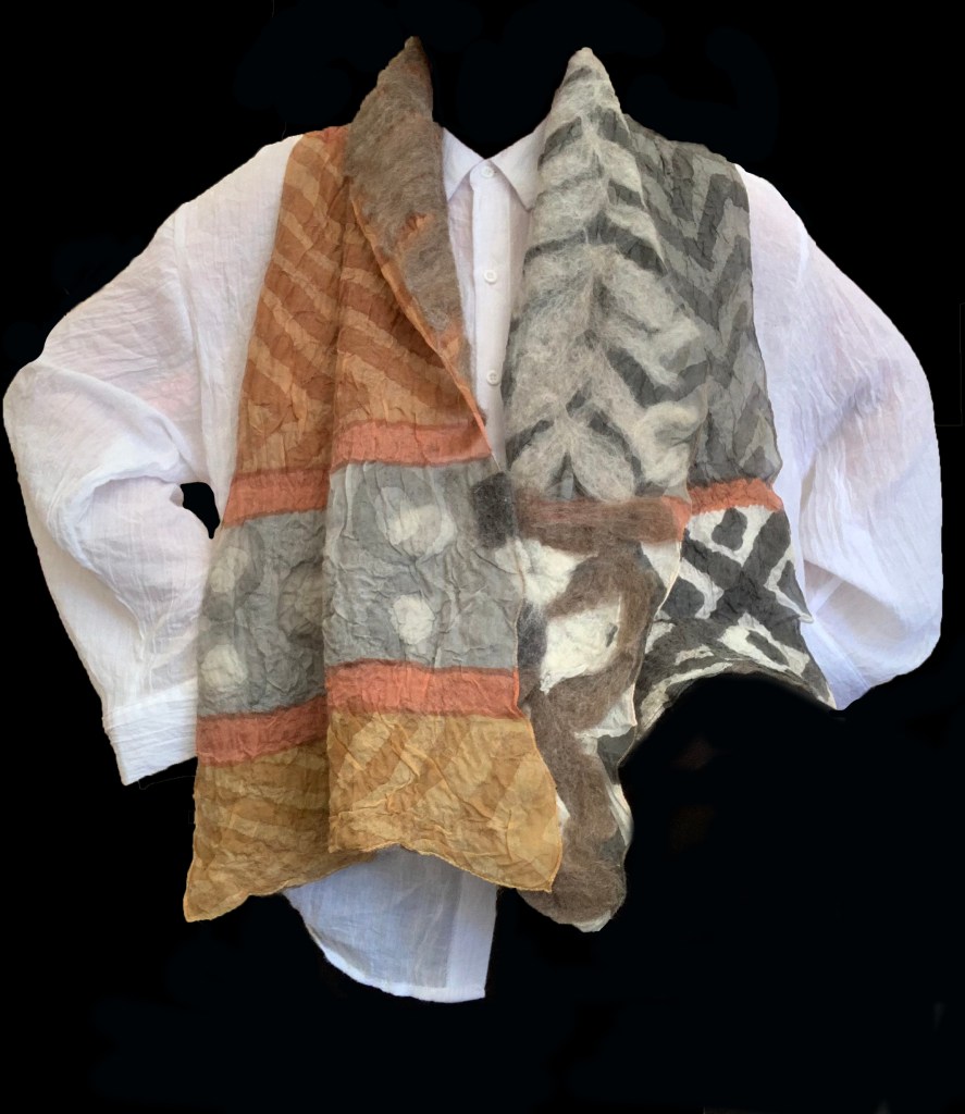 This is a recent self portrait created using an artisanal piece from my 2017 nuno felted scarf collection. In fact this piece has a special place in my heart as it was actually the very first piece of nuno felt I ever created. I love it still, seven years later, even with all of its beginner’s imperfections. Nuno felting is a wet felting process that uses silk, wool, hot water and agitation to cause the wool to migrate through silk and bond to it. When the wool dries it shrinks and gives the silk a wonderful puckered texture…